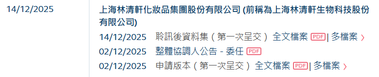 林清轩的港股上市之路在2025年下半年明显加快。公司曾于2025年5月29日首次向港交所递交上市申请。随后,在2025年12月2日,公司第二次递交了申请文件,并在短短十余天后便通过了上市聆讯。